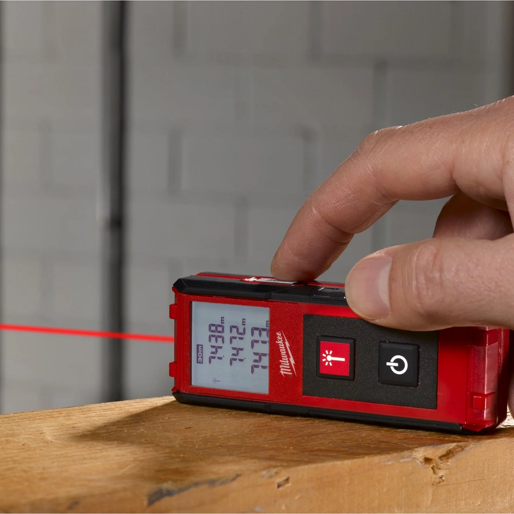 Milwaukee 30M Laser Distance Measure are designed to provide the easiest measurements from all orientations, Backlit screens offer maximum visibility in low light conditions, Includes memory storage for 3 past readings and impact-resistant over mold for protection from tough jobsite conditions, Also features a side shot button for an easier, more ergonomic experience when measuring in all directions.